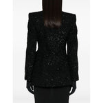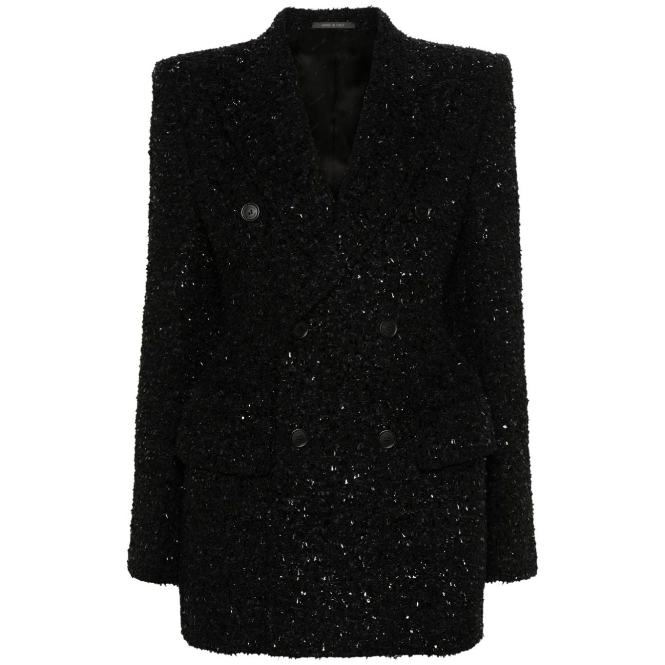 black wool blend tweed bouclé design peak lapels shoulder pads long sleeves with buttoned cuffs two front flap pockets two side inset pockets straight hem full lining double-breasted button fastening Wool blend coat Size and Fit - This piece fits true to size. We recommend you get your regular size. Model is 1,75m / 5ft 8in wearing size 36 (FR)
