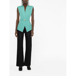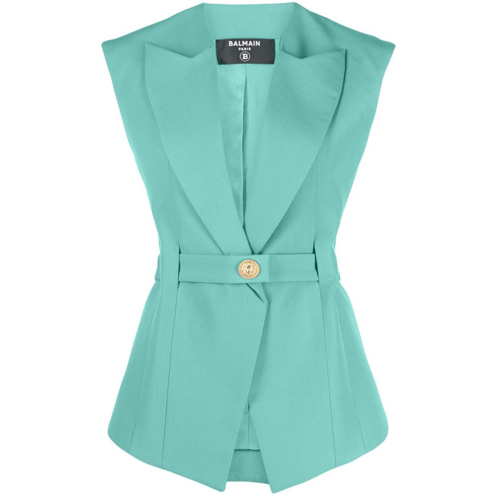 belted-waist sleeveless jacket from Balmain featuring green, cotton, peak lapels, sleeveless and belted waist. Sleeveless belted wool jacket Size and Fit - This piece fits true to size. We recommend you get your regular size. Model is 1,75m / 5ft 8in wearing size 36 (FR)