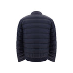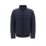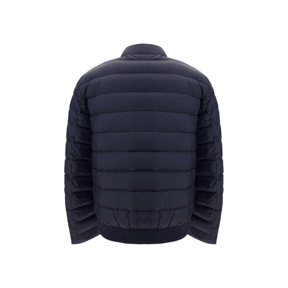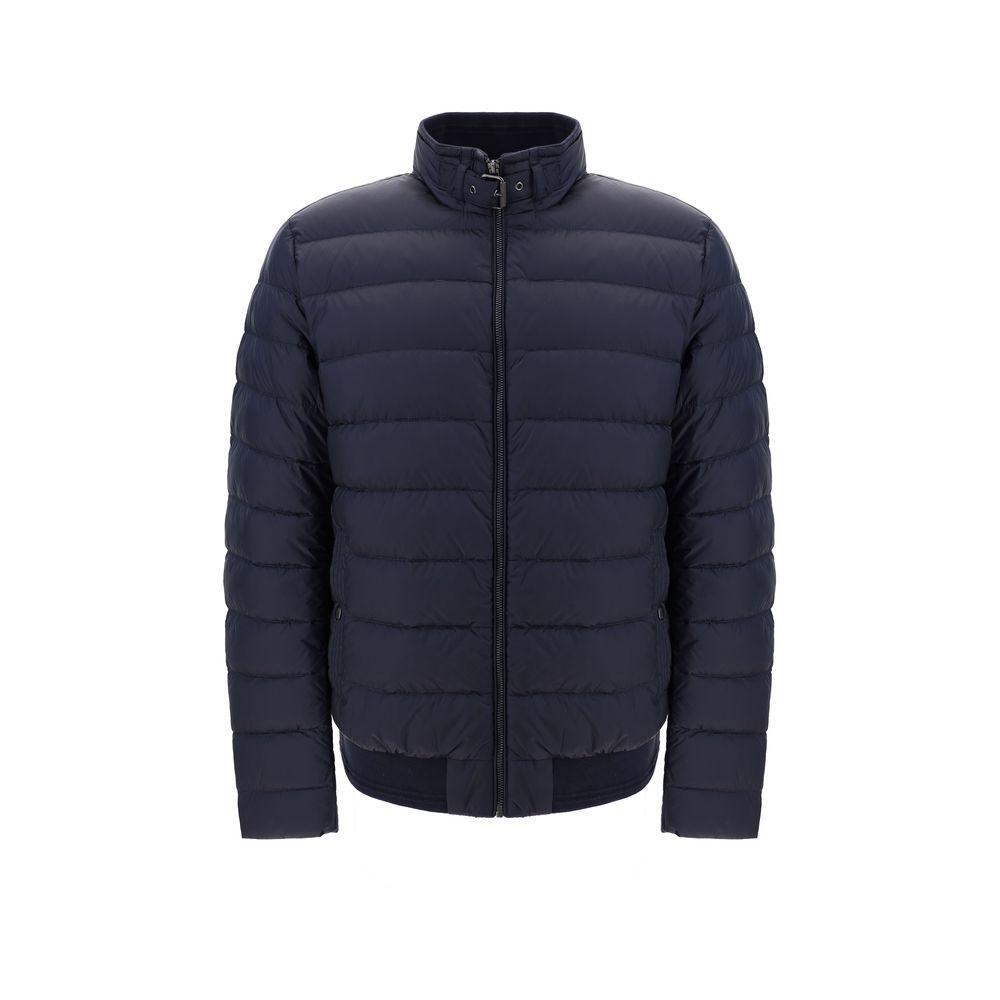Circuit Down Jacket by Belstaff, high collar model adjustable with buckle, front closure by double-slider zipper, two welt pockets with side snap buttons, elasticated cuffs, elasticated ribbed hem, iconic brand monogram patch on left sleeve, monochrome pattern, regular fit.