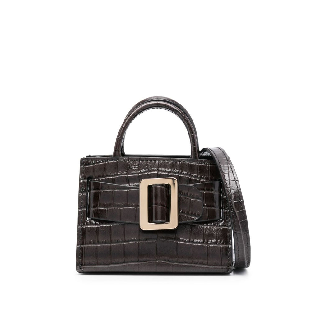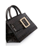 Borsa nero, in pelle di vitello, grana liscia, effetto coccodrillo in rilievo, fibbia con logo inciso, chiusura con cinturino con fibbia, cinturino da polso staccabile, due manici superiori arrotolati, tracolla staccabile, scomparto principale e fodera in pelle scamosciata. Bobby Charm leather mini bag Size and Fit - Width 4,13 in / 10,5 cm
