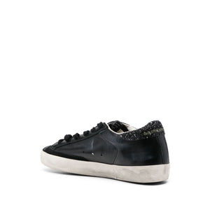 black calf leather signature star patch to the sides logo print to the side glitter detailing front lace-up fastening round toe flat rubber sole Super-Star leather sneakers Size and Fit - Heel 1,6 in / 4 cm Platform 1 in / 2,5 cm