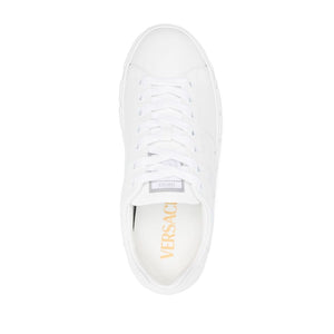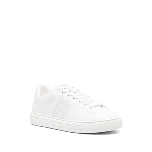 white faux leather smooth grain bead and sequin logo detail logo-embossed signature Greca detailing logo patch at the tongue branded heel counter front lace-up fastening round toe branded insole flat rubber sole Greca sequined sneakers Size and Fit - Heel 1,2 in / 3 cm, Platform 1,2 in / 3 cm