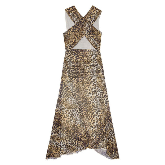 Ganni Leopard Marl Mesh Long Ruched Crossover Dress