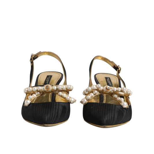Dolce & Gabbana Black Leather Faux Pearls Slingbacks Shoes