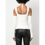 cut-out detail ribbed knit top from ANDREADAMO featuring ivory white, ribbed knit, distressed effect, cut-out detailing, wide shoulder straps, crop sleeves and halterneck tie fastening. Knit ribbed top Size and Fit - This piece fits true to size. We recommend you get your regular size. Model is 1,75m / 5ft 8in wearing size S