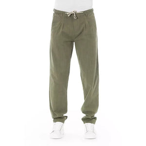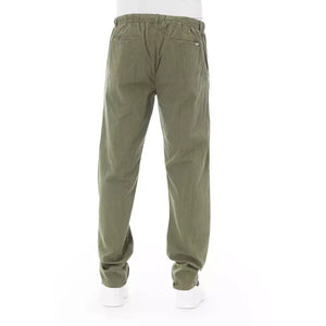 Elevate your style with Baldinini Trend’s precisely tailored chino trousers. Designed for the modern man, these pants feature a sharp front zipper and button closure, complemented by sleek side pockets and refined back welt pockets. Fashioned from premium 100% cotton for unmatched comfort and durability, each pair promises to enhance your ensemble with its chic army color. These trousers are a testament to Baldinini’s commitment to luxury and style perfection.