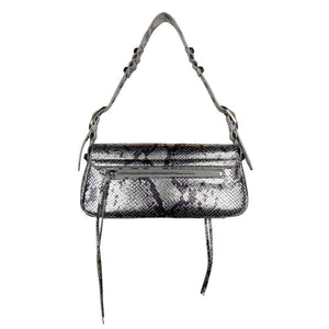Balenciaga shoulder bag, silver snakeskin pattern, made in italy, button and zipper closure. Measurements: 31x15x8cm
