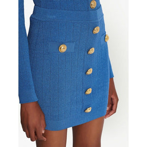 buttoned-short-knit-pencil-skirt from Balmain featuring blue, knitted construction, pencil silhouette, embossed gold-tone buttons, decorative button detailing, front flap pockets and short rear zip fastening. Embossed-buttons knit mini skirt Size and Fit - This piece fits true to size. We recommend you get your regular size. Model is 1,75m / 5ft 8in wearing size 36 (FR)