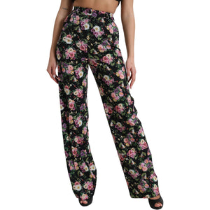 Dolce & Gabbana Black Floral Wool High Waist Wide Leg Pants