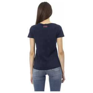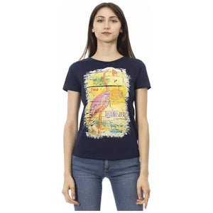 Make a statement in unparalleled style with the Trussardi Action short sleeve T-shirt. Boasting a striking front print design on exquisite blue fabric, this round-neck top is the epitome of effortless chic. Crafted from a luxurious blend of cotton and viscose, it offers not only aesthetic finesse, but unparalleled comfort too. So, step out with confidence and let your wardrobe speak volumes about your bold fashion sense.