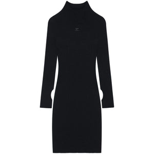 black cotton-wool blend ribbed knit logo patch at the chest mock neck thumbhole long sleeves thigh-length Organic cotton mini dress Size and Fit - This piece fits true to size. We recommend you get your regular size. Model is 1,75m / 5ft 8in wearing size S
