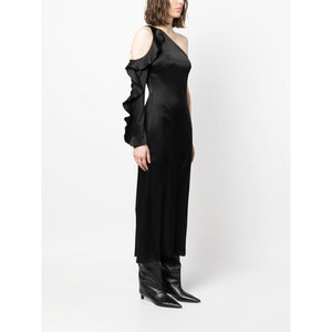 asymmetric ruffle-trim satin dress from DAVID KOMA featuring black, satin finish, asymmetric neck, ruffled detailing, single long sleeve, fitted waistline, concealed side zip fastening, empire line and mid-length. Ruffle detail one shoulder midi dress Size and Fit - This piece fits true to size. We recommend you get your regular size. Model is 1,75m / 5ft 8in wearing size 8 (UK)