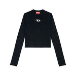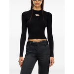 black EcoVero™ viscose silver-tone logo plaque cut-out detailing round neck long sleeves straight hem M-Valari ribbed sweater Size and Fit - SLEEVE LENGTH: 62.0 Centimetres. LENGTH: 46.0 Centimetres. BUST: 64.0 Centimetres. Shoulder Width: 29.0 Centimetres.