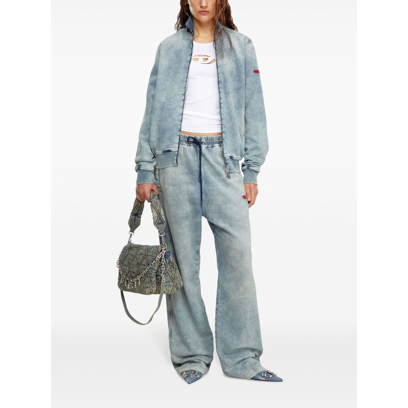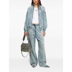 • Model wearing Diesel Top White and denim jacket with matching pants, holding a designer handbag, showcasing casual fashion style.