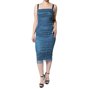 Dolce & Gabbana Blue Mesh Trim Ruched Tulle Sheath Dress
