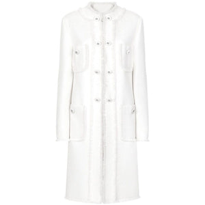 white tweed frayed edge crew neck concealed front fastening long sleeves four front patch pockets knee-length straight hem Wool tweed coat Size and Fit - This piece fits true to size. We recommend you get your regular size. Model is 1,75m / 5ft 8in wearing size 40 (IT)