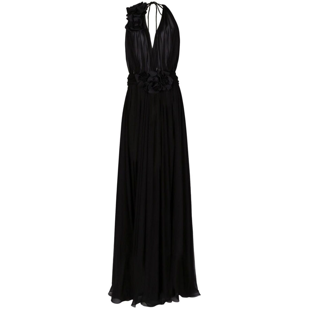 floral-detail pleated silk dress from DOLCE & GABBANA featuring black, silk, fully pleated, floral appliqué, V-neck, halterneck tie fastening, A-line skirt and floor-length. Silk long dress Size and Fit - This piece fits true to size. We recommend you get your regular size. Model is 1,75m / 5ft 8in wearing size 40 (IT)