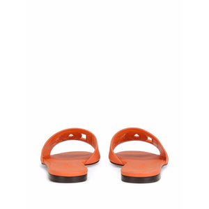 Calf leather embossed logo to the front cut-out detailing almond toe branded insole flat rubber sole. DG Logo leather flat sandals Size and Fit - Heel 0,6 in / 1,5 cm.