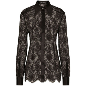 semi-sheer floral-lace shirt from DOLCE & GABBANA featuring black, semi-sheer construction, floral-lace detailing, classic collar, front button fastening, long sleeves, buttoned-cuff sleeves and scallop hem. Lace shirt Size and Fit - This piece fits true to size. We recommend you get your regular size. Model is 1,75m / 5ft 8in wearing size 40 (IT)