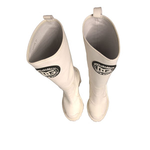 Gorgeous brand new, 100% Authentic Dolce & Gabbana synthetic leather and rubber biker hi trekking boots with DG metal logo in white.