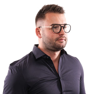 Man wearing Dsquared² Sleek Black Full-Rim Designer Eyewear with black frames and a dark shirt, showcasing unisex style.
