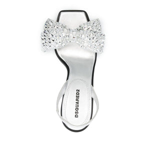 bow-detail sqaure-toe sandals from DSQUARED2 featuring silver-tone, calf leather, crystal embellishment, bow detailing, open toe, square toe, single toe strap, elasticated slingback strap, branded footbed and high heel. Rhinestone details heel sandals Size and Fit - Heel 4,5 in / 11,5 cm; Platform 0,6 in / 1,5 cm