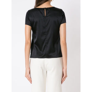 Blue stretch-silk scoop neck T-shirt from EMPORIO ARMANI featuring scoop neck, short sleeves, straight hem and stretch-design. Silk top Size and Fit - This piece fits true to size. We recommend you get your regular size. Model is 1,75m / 5ft 8in wearing size 40 (IT)