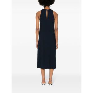 navy blue cady texture crew neck sleeveless satin trim straight hem mid-length single rear button fastening Sleeveless midi dress Size and Fit - This piece fits true to size. We recommend you get your regular size. Model is 1,75m / 5ft 8in wearing size 40 (IT)
