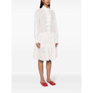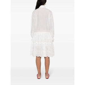 off-white cotton floral embroidery scallop collar long sleeves elasticated cuffs fabric-covered buttons drawstring waist ruffled panels internal logo tag thigh-length front button placket Embroidered shirt dress Size and Fit - This piece fits true to size. We recommend you get your regular size. Model is 1,75m / 5ft 8in wearing size 40 (IT)