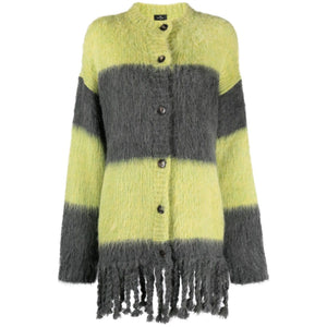 striped fringed wool cardigan from Etro featuring alpaca wool-blend, knitted construction, horizontal stripe pattern, round neck, long sleeves, front button fastening, two side slit pockets, fringed edge, ribbed trim, yellow and grey. Striped wool blend cardigan Size and Fit - This piece fits true to size. We recommend you get your regular size. Model is 1,75m / 5ft 8in wearing size 40 (IT)