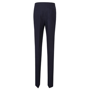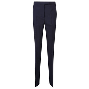 Blue trousers, closing with asymmetrical tab, pocket with fillet on the back, ironed fold, straight leg, two pockets. Wool trousers Size and Fit - This piece fits true to size. We recommend you get your regular size. Model is 1,75m / 5ft 8in wearing size 40 (IT)