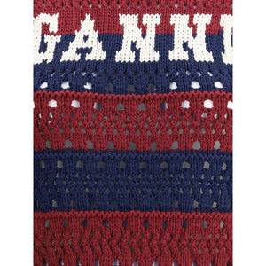 Ganni’s striped cotton Vest is a garment with a fresh, modern style. Made with a perforated knit design, it features a ribbed crew neck and hem that define the silhouette. The iconic contrasting signature on the front adds a distinctive touch, making this vest perfect for those seeking a casual yet sophisticated look.