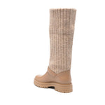 desert beige calf leather panelled design slip-on style ribbed-knit panel strap detailing decorative buckle detail round toe branded leather insole knee-length 40mm stacked heel rubber lug sole This piece comes complete with a protective dust bag. Knitted boots Size and Fit - Heel 1,6 in / 4 cm