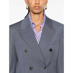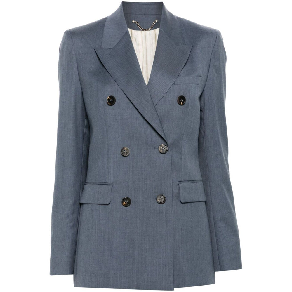 blue-grey virgin wool textured finish double-breasted button fastening peak lapels shoulder pads long sleeves buttoned cuffs chest welt pocket two side flap pockets signature two-stars appliqué hardware English rear vents full lining straight hem Journey double-breasted jacket Size and Fit - This piece fits true to size. We recommend you get your regular size. Model is 1,75m / 5ft 8in wearing size 40 (IT)
