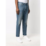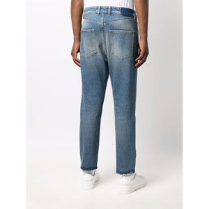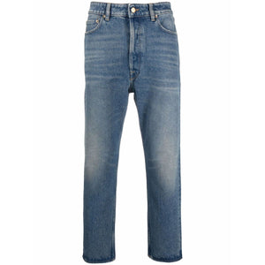 medium blue cotton mid wash whiskering effect low-rise straight leg front button and zip fastening classic five pockets Denim cotton jeans Size and Fit - This piece fits true to size. We recommend you get your regular size. Model is 1,84m / 6ft 1in wearing size 32 (WAIST CM)