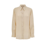 Classic collar, front fastening with fabric-covered buttons. Tone-on-tone stripes with allover horsebit print, rounded at the bottom.