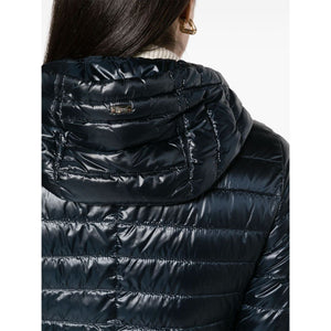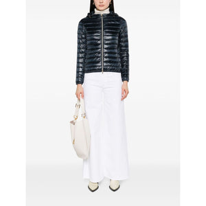 navy blue feather down padded design quilted gold-tone logo plaque logo-engraved gold-tone hardware detachable drawstring hood front two-way zip fastening long sleeves elasticated cuffs two side zip-fastening pockets elasticated hem quilted lining Nylon short down jacket Size and Fit - This piece fits true to size. We recommend you get your regular size. Model is 1,75m / 5ft 8in wearing size 40 (IT)