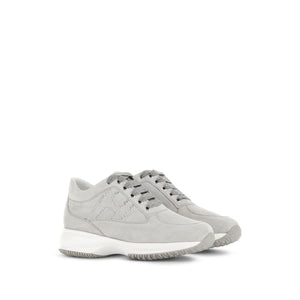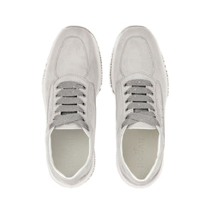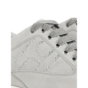 Interactive crystal-embellished sneakers from HOGAN featuring medium grey, calf leather, suede, crystal embellishment, logo-embellished side panels, round toe, front lace-up fastening and flat rubber sole. Interactive suede sneakers Size and Fit - Heel 1,6 in / 4 cm; Platform 1 in / 2,5 cm