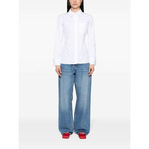 white cotton poplin texture classic collar long sleeves with buttoned cuffs chest patch pocket triangular open back with adjustable belt straight hem front button fastening La Chemise De Costume shirt Size and Fit - This piece fits true to size. We recommend you get your regular size. Model is 1,75m / 5ft 8in wearing size 36 (FR)