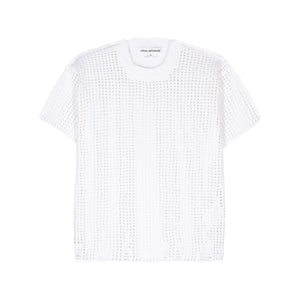 cream white panelled design open knit crew neck short sleeves straight hem Opne-knit crewneck t-shirt Size and Fit - This piece fits true to size. We recommend you get your regular size. Model is 1,75m / 5ft 8in wearing size S