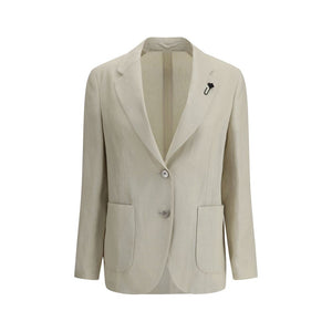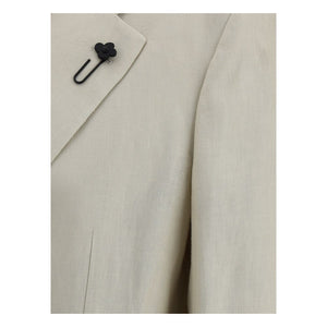 The Lardini Linen Blazer is an elegant and sophisticated piece, perfect for the warmer seasons thanks to the lightness of linen. The classic lapels give a formal and refined look, while the single-breasted front closure with buttons adds structure and cleanliness to the design. The two patch pockets on the front offer functionality without compromising aesthetics, maintaining an elegant and sober look. The iconic flower pin applied on the lapels is a distinctive touch that enriches the blazer with an accent of originality and style. A versatile piece, ideal for elegant occasions or to add a touch of class to a casual-chic outfit.