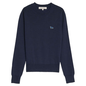 navy blue merino wool knitted construction ribbed-knit edge mélange effect signature fox motif logo patch at the chest crew neck long sleeves ribbed cuffs and hem straight hem Baby Fox wool jumper Size and Fit - This piece fits true to size. We recommend you get your regular size. Model is 1,75m / 5ft 8in wearing size S