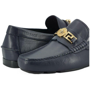Step into luxury with these impeccable Versace men’s loafers, brand new and accompanied by the original box, tags, and a protective dust bag. Crafted from the finest 100% calf leather in a sophisticated navy blue, these loafers are the epitome of elegance. Adorned with gold-toned metal hardware featuring the iconic Medusa and logo details, these shoes are a true statement of opulence and style.