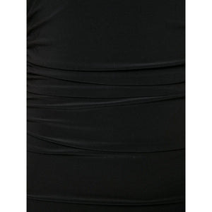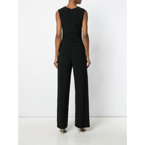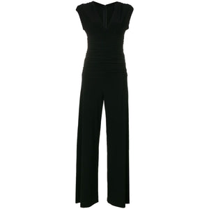 Black ruched plunge jumpsuit from Norma Kamali. V neck jumpsuit