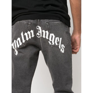 Faded black cotton blend logo-print straight-leg jeans from PALM ANGELS featuring mid-rise, belt loops, front button and zip fastening, classic five pockets, logo print to the rear, straight leg and slim cut. Curved Logo denim jeans Size and Fit - This piece fits true to size. We recommend you get your regular size. Model is 1,84m / 6ft 1in wearing size 32 (WAIST CM)