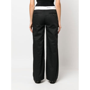 reversed waistband trousers from PALM ANGELS featuring black/white, cotton blend, logo waistband and straight leg. Flare-leg trousers Size and Fit - This piece fits true to size. We recommend you get your regular size. Model is 1,75m / 5ft 8in wearing size S