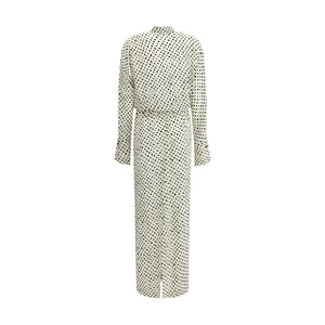 Petar Petrov’s silk long Dress features an all-over polka dot pattern that adds a touch of playful elegance. It is a long-sleeved design with adjustable button cuffs and a classic collar that completes the sophisticated design. The front button closure and elasticated waistband offer a comfortable fit. In addition, the dress features wide slits on the front and back, giving the garment movement and sophistication.