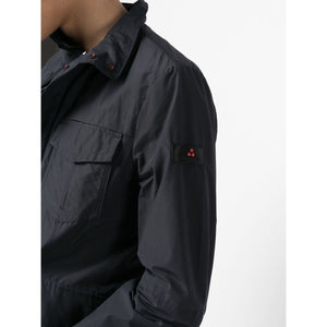 flap-pocket cotton-blend jacket from PEUTEREY featuring logo patch at the sleeve, concealed front fastening, long sleeves, four front flap pockets, navy blue, cotton blend and stand-up collar. Metal blouson jacket Size and Fit - This piece fits true to size. We recommend you get your regular size. Model is 1,84m / 6ft 1in wearing size M