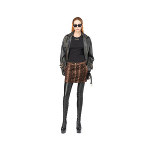 Elevate your wardrobe with the audacious PINKO corduroy miniskirt—where Italian craftsmanship meets modern flair. Enveloped in a captivating snake print, this straight-cut statement piece boasts slanted side pockets and perfect-fit belt loops. A smooth metal zip closure adorned with a chic stud button cinches the design, embodying PINKO’s bold panache.