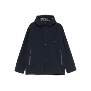 navy blue front press-stud fastening concealed front zip fastening two side zip-fastening pockets embroidered logo at the chest Hooded jacket Size and Fit - Width 10,83 in / 27,5 cm